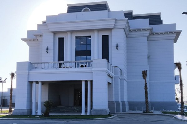 The scope included the main and annex buildings, five private villas, security gates, fence columns, and landscape features. We executed 4,000 m² of fiber cement boards across the façades and 8,000 m² of GRC for decorative cornices, cladding, and columns.